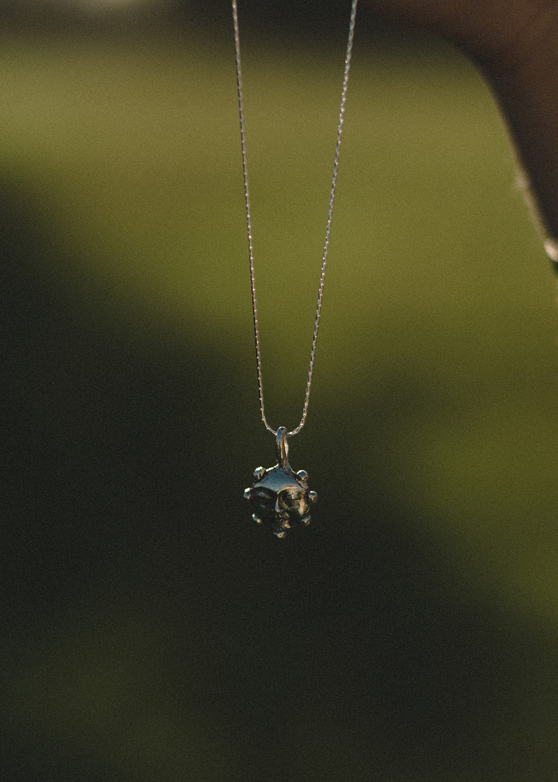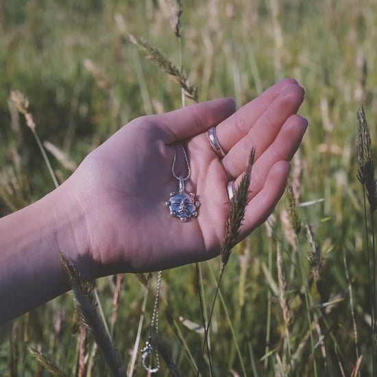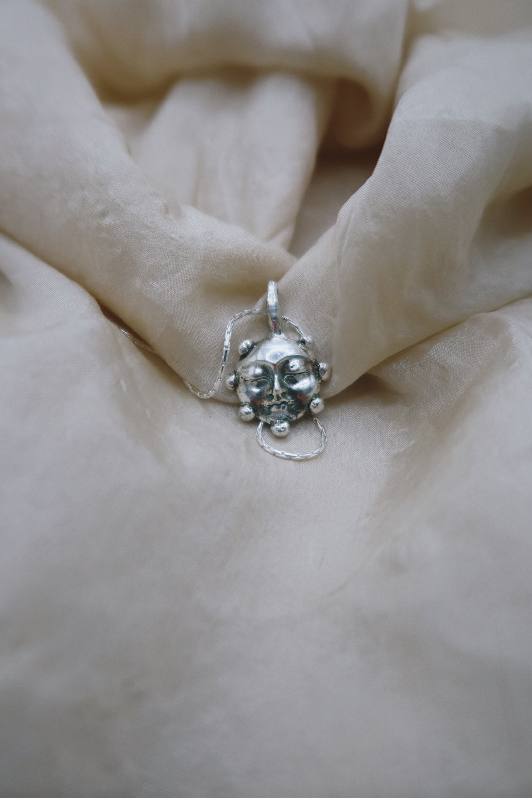 Handcrafted ornamental object in solid 925 silver on a sterling silver box chain - made by Madeline Harris at home.