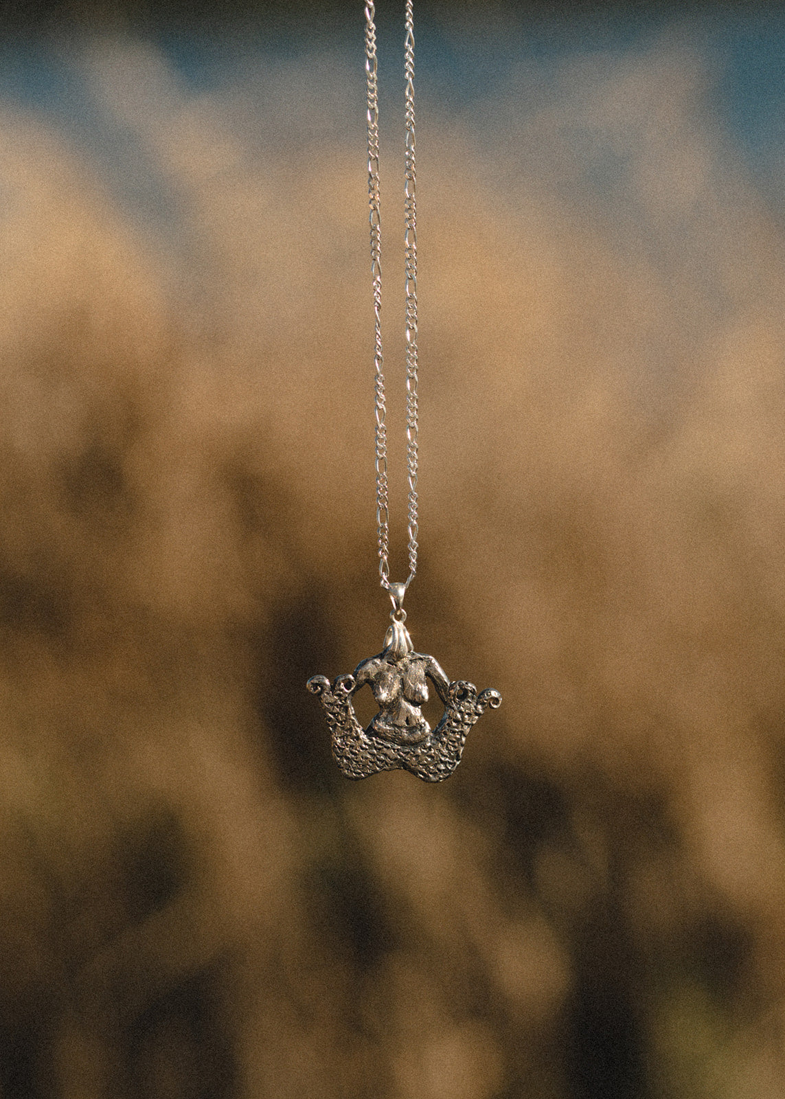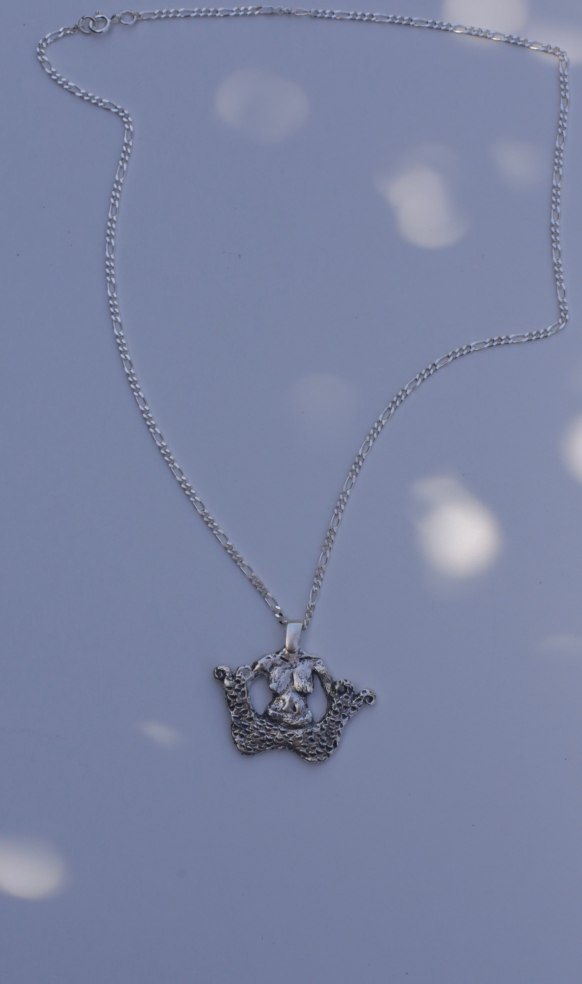 Luxury Sustainability for generational adornment. Handcrafted ornamental object in solid 925 silver on a sterling silver Figaro chain - made by Madeline Harris at home.